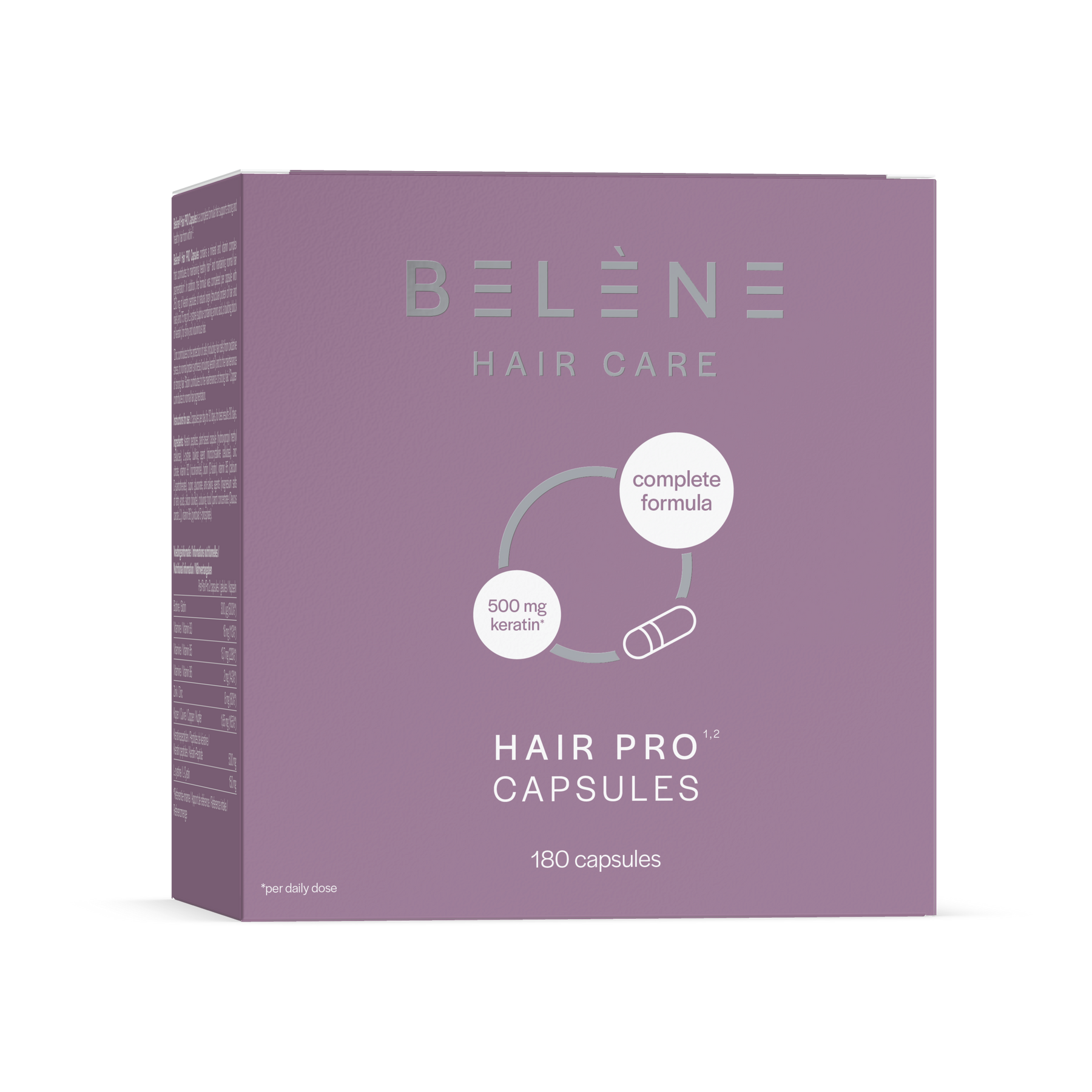 Keratin peptides, plant-based capsule (hydroxypropyl methyl cellulose), L-cystine, bulking agent (microcrystalline cellulose), zinc citrate, vitamin B3 (nicotinamide), biotin (D-biotin), vitamin B5 (calcium D-pantothenate), cupric gluconate, anti-caking agents (magnesium salts of fatty acids, silicon dioxide), colouring food (carrot concentrate (Daucus carota L.)), vitamin B6 (pyridoxal 5’-phosphate).